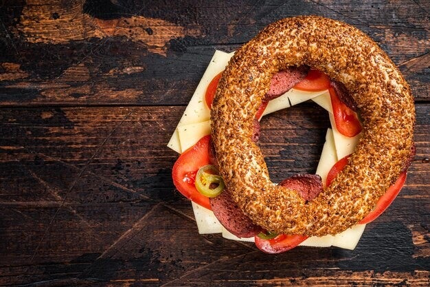 Sucuk, gazi, tomaat tussen een heerlijke simit!