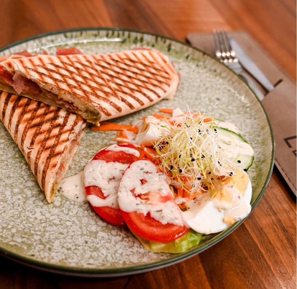 Seranoham, pesto, tomaat, mozzarella